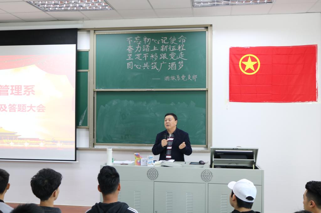 为认真学习贯彻党的“十九大”精神,11月23日酒店与旅游管理系(以下简称“酒旅系”)在酒管楼A301举行了入党积极分子培训及答题大会。酒旅系200多名入党积极分子及系部党员教师均参加了此次大会,现场座无虚席,师生们学习热情高涨。