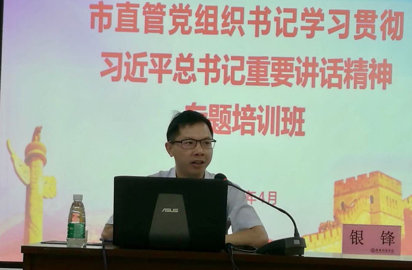 【本院消息】4月28日上午,校党总支书记戴炳源、副书记宫峰和六个基层党支部书记及专职干部一起,参加了由市委社会工委举办的市直管党组织书记学习习近平总书记重要讲话精神专题培训班。大家认真聆听了由东莞理工学院马克思主义学院副院长银锋教授作的专题宣讲。银锋从学习领会习近平总书记在十三届全国人大会议广东代表团的重要讲话的要点、对广东“四个走在前列”解读、结合实际贯彻落实等三个方面,向参加培训班的学员干部作了学习辅导。