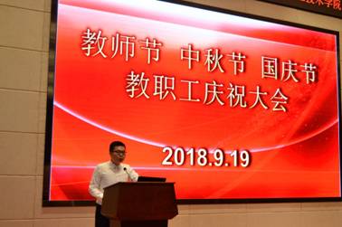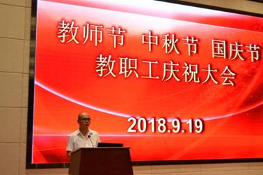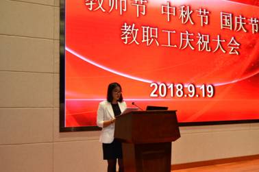 2018年9月19日下午三点,我校于多功能报告厅举办以“师表如炬·中秋梦圆·国运昌盛”为主题的教师节、中秋节、国庆节三节教职工庆祝大会,全校教职工、优秀学生代表共298人出席参加了本次大会,大会由卢东亮副校长主持。