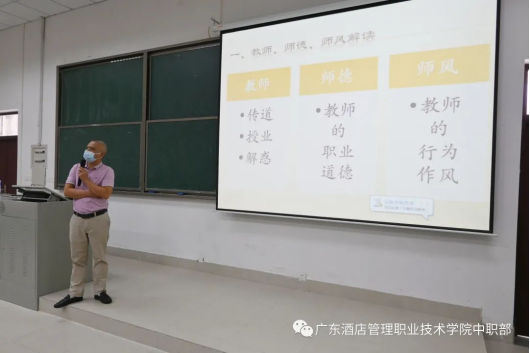 军事训练过后,由中职部戚剑奇常务副校长为老师们进行师风师德培训。戚校长把自身多年以来的从教经验分享给老师们,教导老师们如何从日常行为、教学方式、与学生相处的方式等层面中要求自己。
