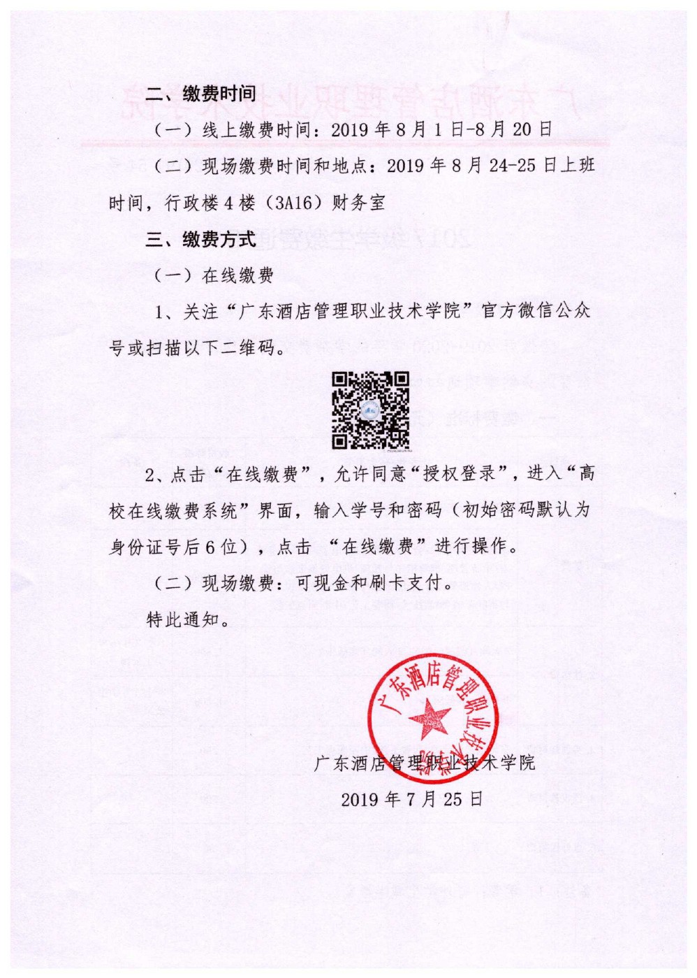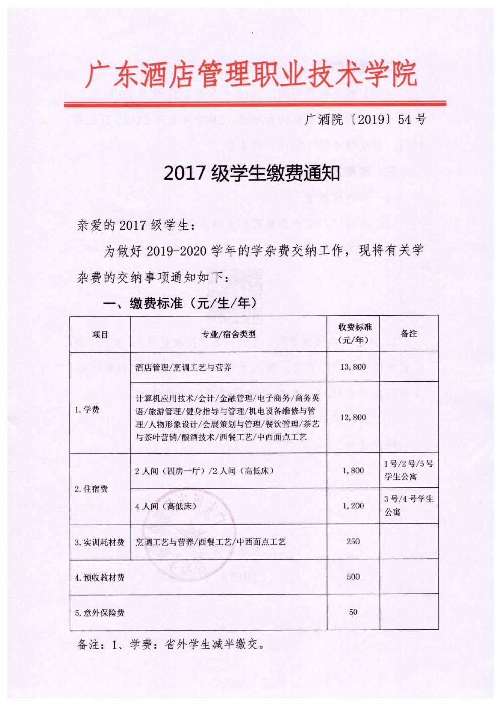 广东酒店管理职业技术学院2019-2020学年2017级缴费通知