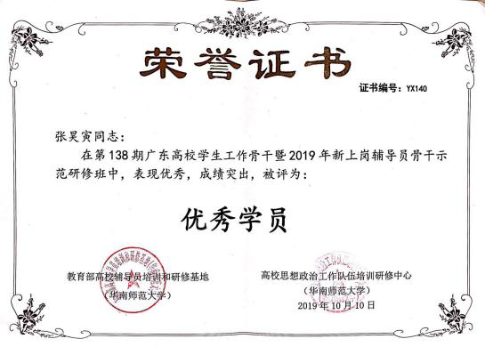 我校酒旅系辅导员张昊寅老师参加2019年新上岗辅导员培训,表现优秀,成绩突出,被评为“优秀学员”荣誉称号。