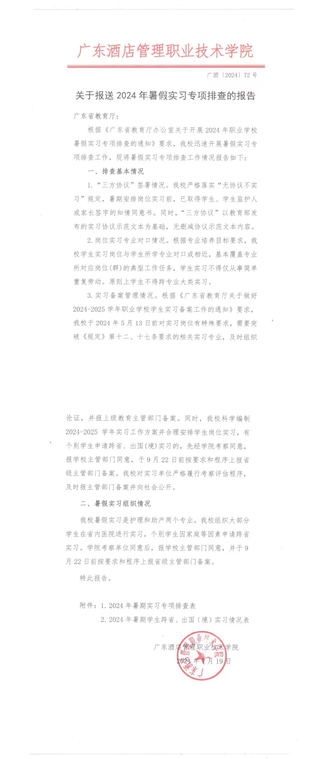 广东酒店管理职业技术学院暑期实习专项排查(2024.7.9)